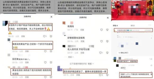 同时,已有网友在中福黄金集团视频号下留言:“现在都不发货了,很是怀疑/不管买多少都得要发货吧,都要兑现承诺吧”;还有网友在平台表示“听说有不少客户现金不能如期兑换,该公司总往后拖延,购买需谨慎,天上不会掉馅饼/我爸买的黄金产品已经快一个多月不给返钱/黄金也没给买的这个是只给钱的到现在钱也没给/现在很多商品都没了,董事长讲话跟放屁一样”。
