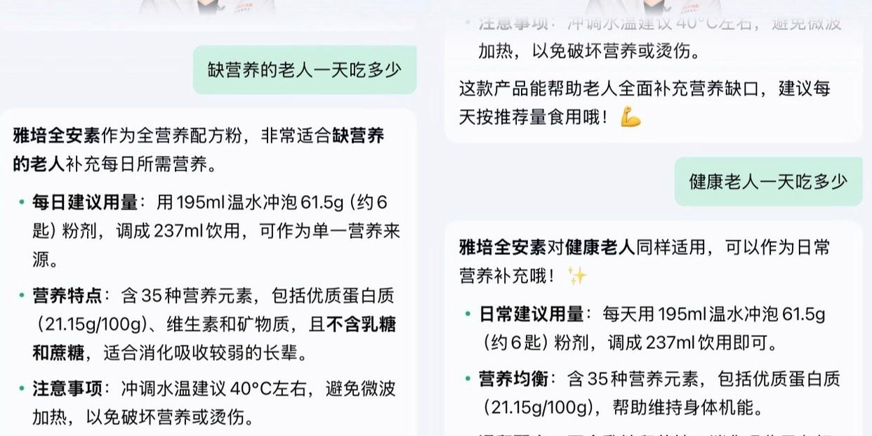 令人哭笑不得的是,当记者向AI提问“缺营养的老人一天吃多少”时,得到的答案,和给健康老人的建议用量完全相同。而针对记者提出的问题,AI营养师也并未进一步询问老人的身高体重、进食状况等信息。