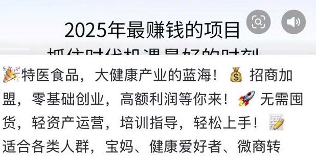 除了线下药店和网购平台,记者看到,还有不少人在社交平台上发广告推销特医食品。除了直接卖货,有人甚至还把特医食品称为“大健康产业的蓝海”“2025年最赚钱的项目”,适合各类人群“零基础创业”。