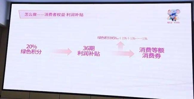 关于消费补贴,讲师称:“你消费了1万,最高你能够获得1万消费券的补贴,第一次发放给你的消费补贴,以你的绿色积分为基数,你获得2000的绿色积分,那就是2000乘以千分之五,第一期能获得10个消费券,以后的每一期都比上一期的多给15%,换句话说来我们每一次都是以1.15倍的倍率在不断的倍增,越往后你每一期的补贴就会越来越多,当你补到第35期的时候,以2000积分为基数,第35期你一期就能得到1158个消费券,公司董事长在一次高管会上做出了一个承诺,在公司完成100亿业绩之前,前25期平均三天补给你一期,从第26期开始,根据公司实际的盈利状况,每一天有利润就投,那么最多的补满36期,最高的补到给你的消费额等额的消费券。想不想要钱?后面的伙伴想不想要钱?想要钱我们就来说一说钱,这1万的消费券怎么变成钱!第一个途径来,如果说有新的朋友,他也想消费,他说正好我需要1万的消费券儿,你手里边儿正好有1万个消费券,你把1万的消费券给到他,他给你1万块钱,请问你的消费券有没有变现?变现了!这种方式叫转让,在我的消费券的后台里,都要转账,因为在我的后台里边儿消费券前后左右不分系统,不分上下级都可以去转让,这是第一种变现的方式,如果说你用了这样的一种变现方式的话,你获得了总价值是多少?最初拿了1万块钱,买了价值1万的黄金,拿到手里面的货品有没有价值?市价1万块钱黄金,然后呢36期补贴拿了1万的消费券,这1万的消费券通过转让的方式变现了1万块钱,你的总价值是多少?2万!花了一万,回来了多少呢?2万!请问你的消费有没有增值?增值了!消费竟然还可以赚钱,消费还能够增值,我消费的收益远远超过了消费本身的额度,这就是福宝的魅力所在。第二种你消费了1万块钱,拿了1万块钱黄金,补贴返了以后呢,最高补到1万的消费券,拿着1万的消费券,你反过头来我再次去消费,又能够拿到价值1万的什么黄金或者别的产品,第二次相消费得1万的黄金又能够获得2000的绿色积分,这叫做再次去复销,这就是福宝的魅力所在。”